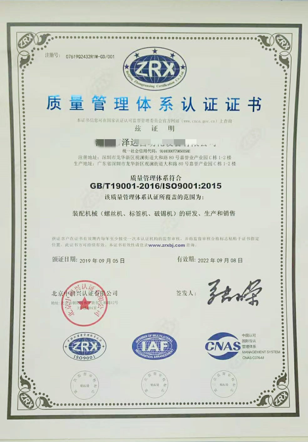 螺絲機(jī)專(zhuān)業(yè)生產(chǎn)廠(chǎng)家已通過(guò)ISO9001質(zhì)量管理體系認(rèn)證